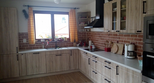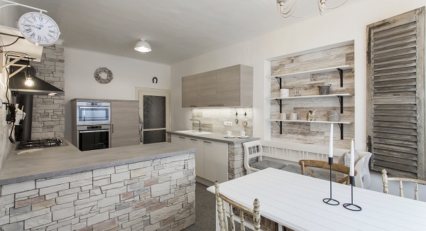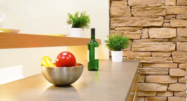 Do not be afraid of the stone veneers in a kitchen. You can use them in combination with traditional ceramic tiling, with glass or wood. The stone veneer can be hydrophobic sealed and thus make their maintenance easy!